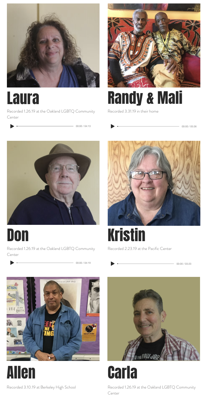 Recorded in 2019, this independent project highlights stories of LGBTQ+ individuals over the age of 60 who have lived in the Bay Area for 20+ years. Excerpts offer a taste of the rich experiences of LGBTQ+ elders and add their narratives to a larger landscape of East Bay stories.